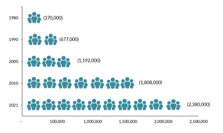 1994年「米国香港関係法」によって、香港+台湾+中国本土の合計割当数が年間76860 人の移民を受け入れて中華系の移民を増やしていきました。右の図は、「Chinese Immigrant Population in the United States, 1980-2021」中国人移民の人口数です。この図を見ると移民が、どんどん増えているのがよく解ります。