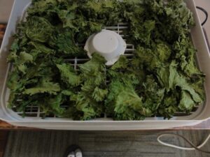 ケールの葉を採って、芯を抜いて葉だけにして適度に小さくして数時間乾燥機にかけます。